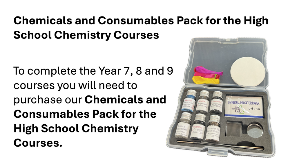 This pack contains the 'challenging to get' chemicals and consumables required for the High School Chemistry Courses.