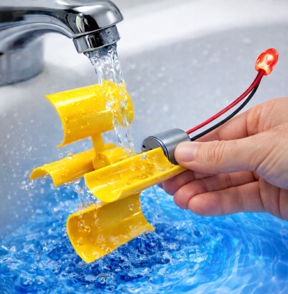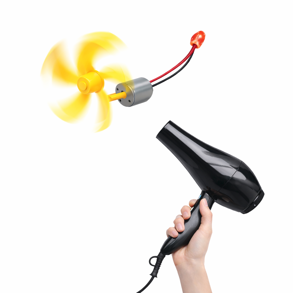 As the blades rotate, kinetic energy from the moving air is converted into mechanical energy, which the generator transforms into electrical energy. Using a simple fan, hairdryer or running water from a tap, it is a great way to visually indicate the electrical output with the low energy consumption LED light (included)