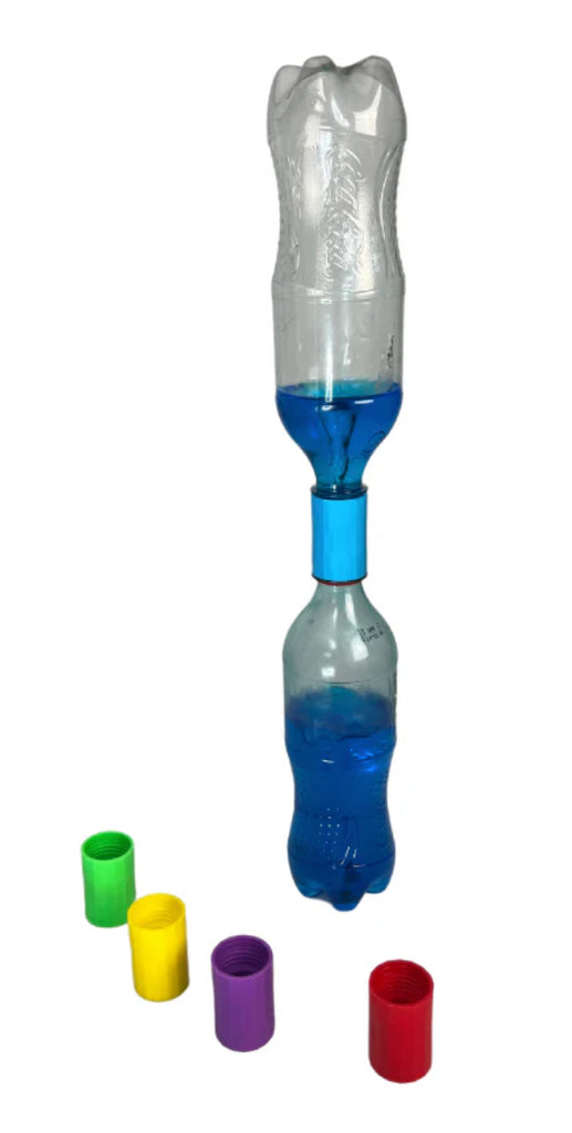 One of the bottles is filled with coloured water, after inverting, give the bottle are swirl and a vortex forms in the top bottle as the water flows to the bottom bottle.